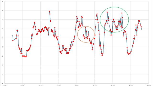 The clustering is easy to see in the graphs above. This also demonstrates how the variability in the one-minute data interacts withe the oref1 algorithm, if shorter SMB intervals are allowed.